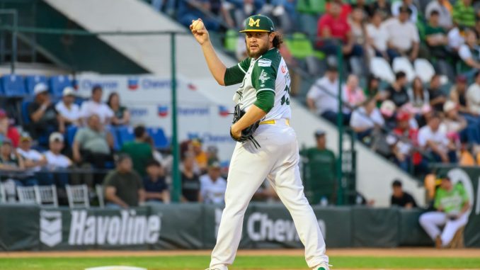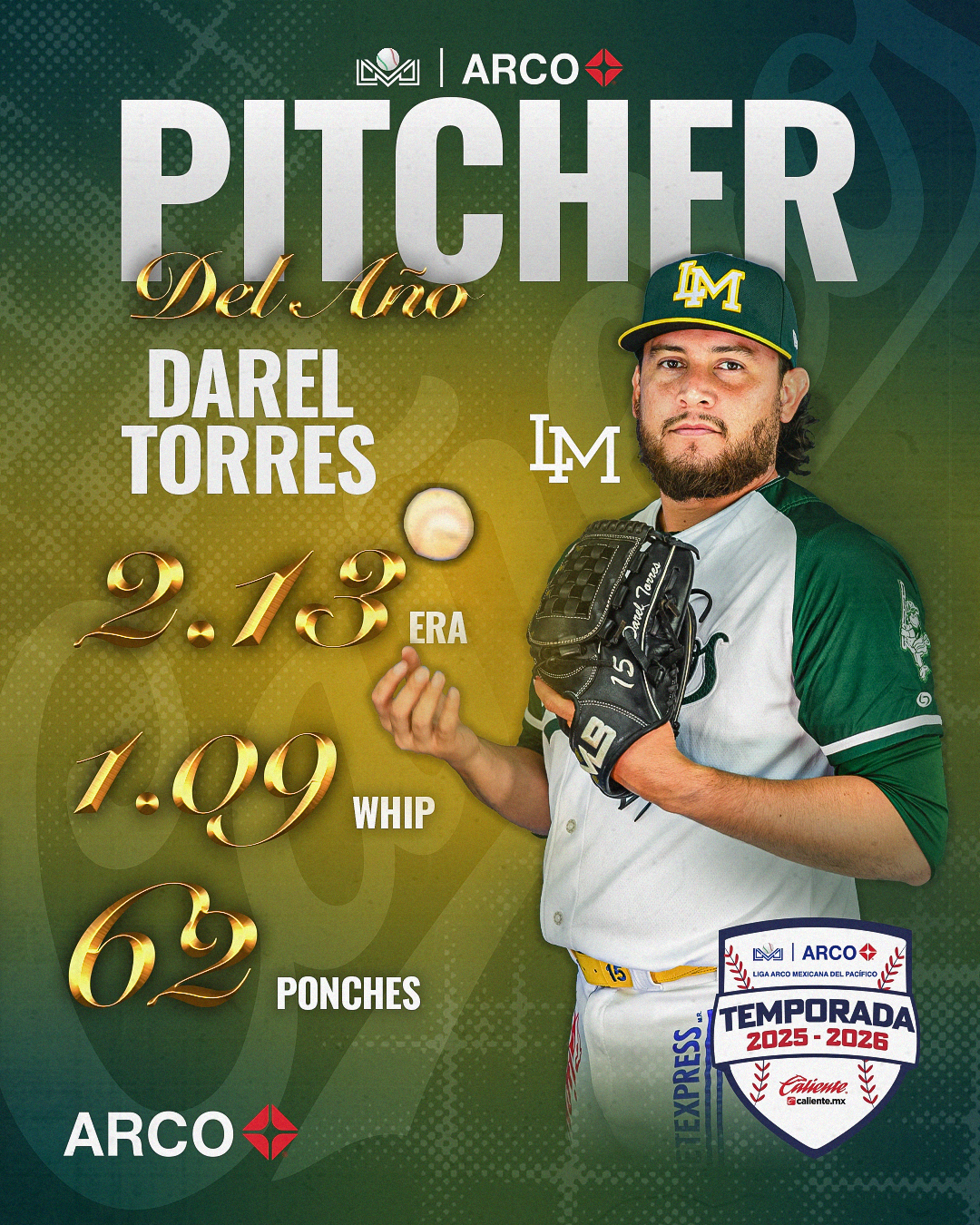 Guadalajara, Jalisco (Comunicación Liga ARCO). – Con una campaña dominante y liderando los departamentos de Efectividad (2.13), ponches (62), WHIP (1.09) y siendo sublíder de triunfos con 6, el derecho de los Cañeros de Los Mochis, Darel Torres, se lleva el Trofeo «Vicente ‘Huevo’ Romo» entregado al Pitcher del Año.
